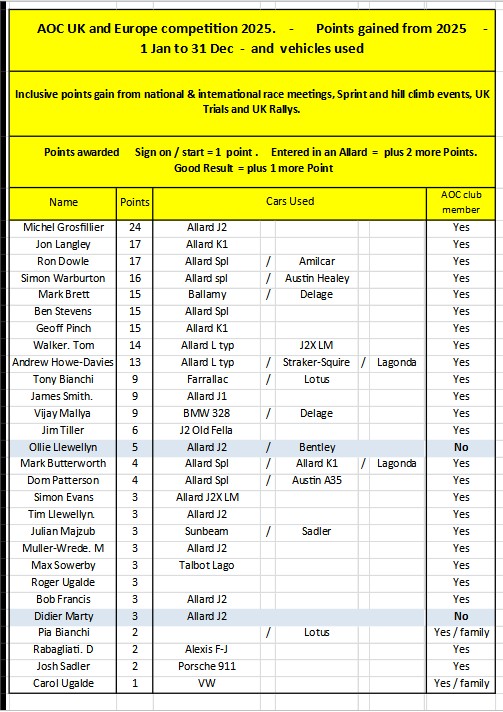 1. All fast non-Allard cars carry a 15 % handicap, which is included in the yearly total.