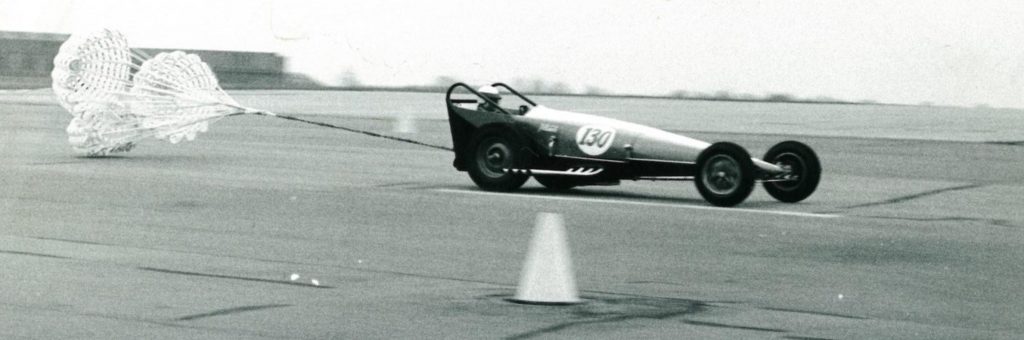 The rear axle was rigidly mounted and the front axle located with forward facing radius rods using a trans- verse leaf spring as the suspension medium. No shock absorbers were used. The inherent friction of the relatively stiff leaf spring providing adequate damping. Steering was via a centrally mounted Allard Marles steering box with an extended cross shaft and then via an intermediate idler located inline with the radius rod pick-up points. To satisfy The RAC a complete aluminium body was fitted. A parachute, was fitted, originating from an aircraft drogue chute which required a new technique to be learnt, how to pack it after each application.