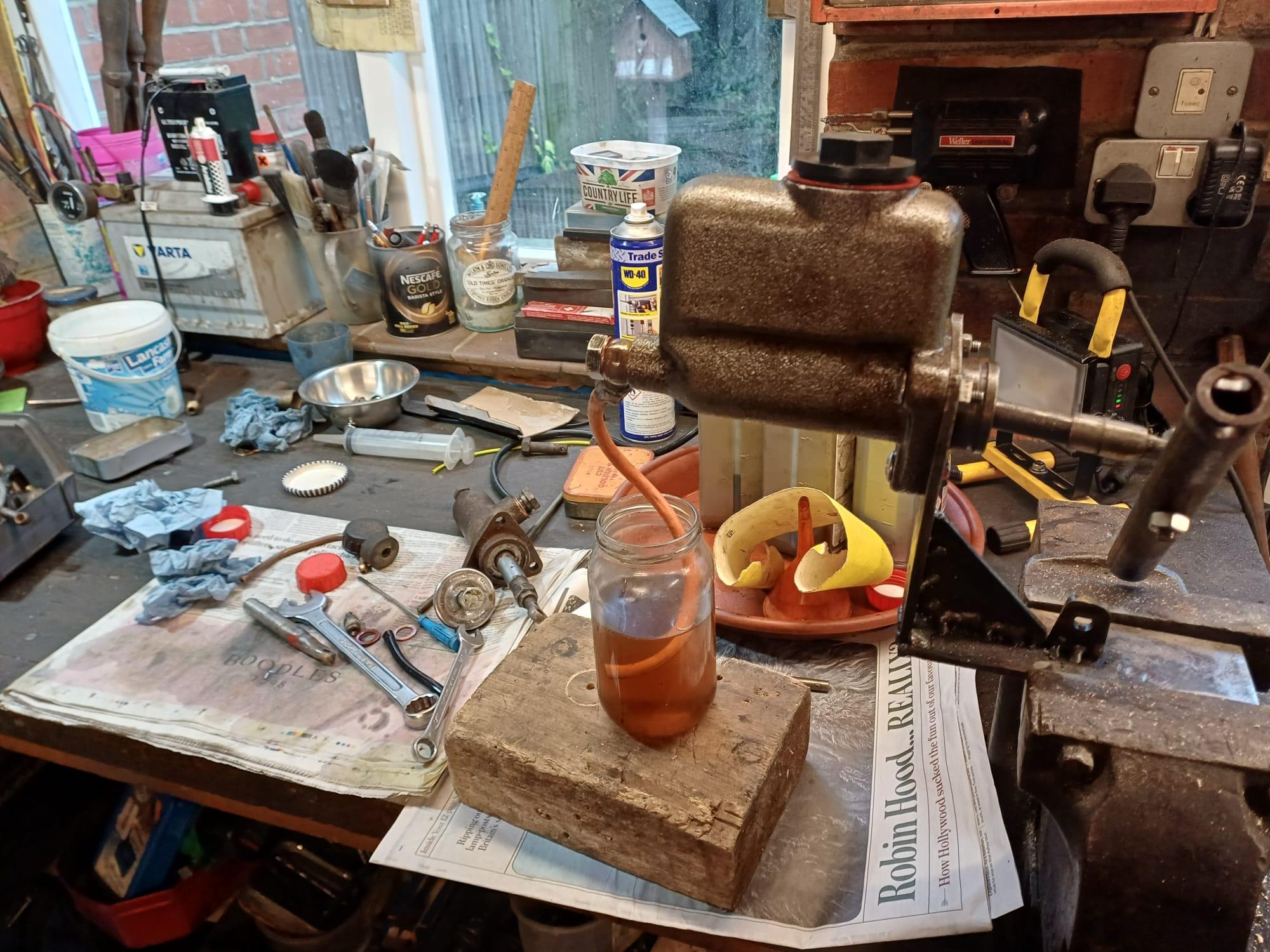 This is my new 1 1/8″ master cylinder from America. When it is on my jig on the bench as soon as I put in some dot 4 I get a firm push straight away. If I bleed the cylinder in the normal way with the ripple and a bleed pipe it works perfectly. When I put it in the car with all the brake pipes connected my pedal goes directly to the floor with all the nipples closed. I have now bleed the brakes on all 4 corners with mire than a litre of dot 4 I cannot get any pedal at all. I tried this several months ago with the same result and I put back the original 1 1/4″ master cylinder and it worked straight away after I bled the brakes in the normal way. Now I will refit the original master cylinder and I am sure it will work again. With the 1 1/4″ master cylinder fitted the brake pedal is so hard it is uncomfortable to drive.
