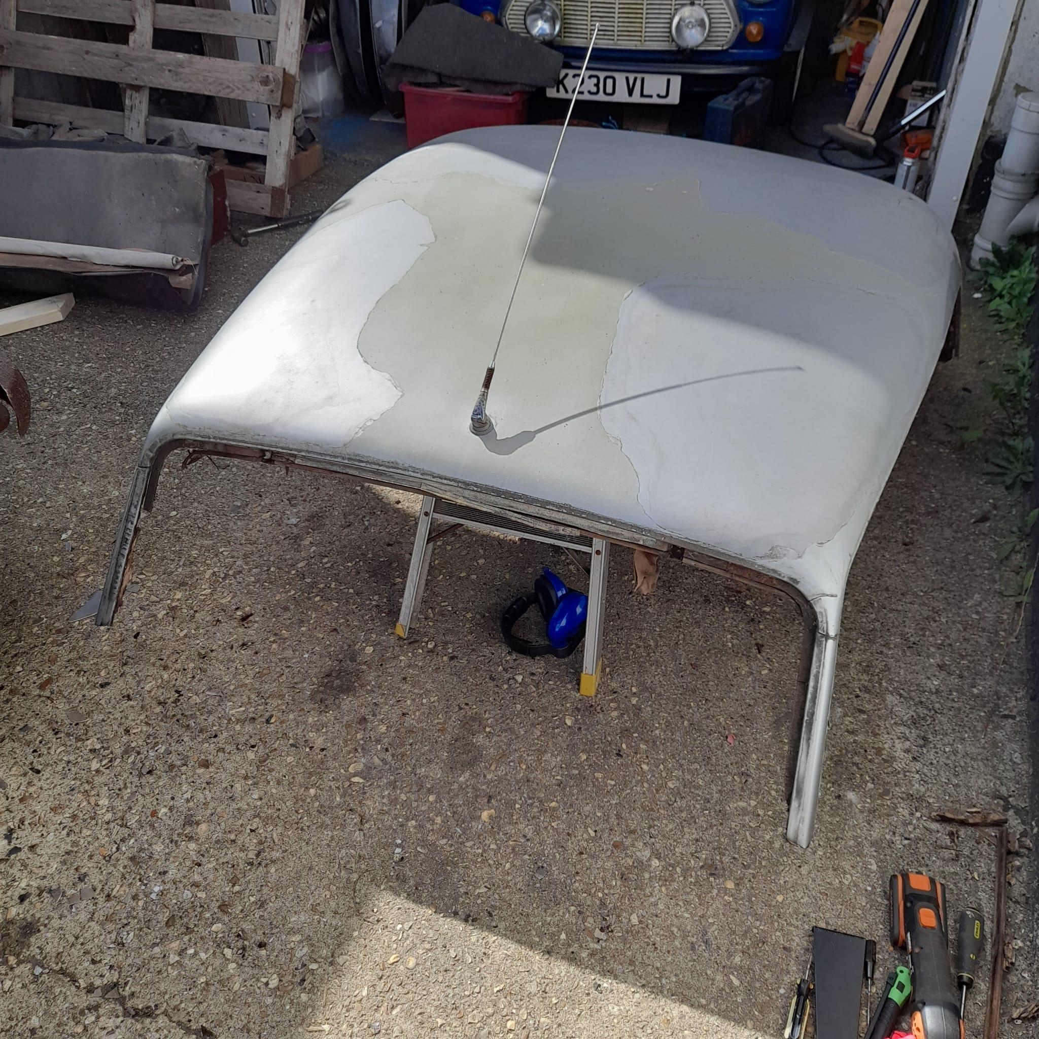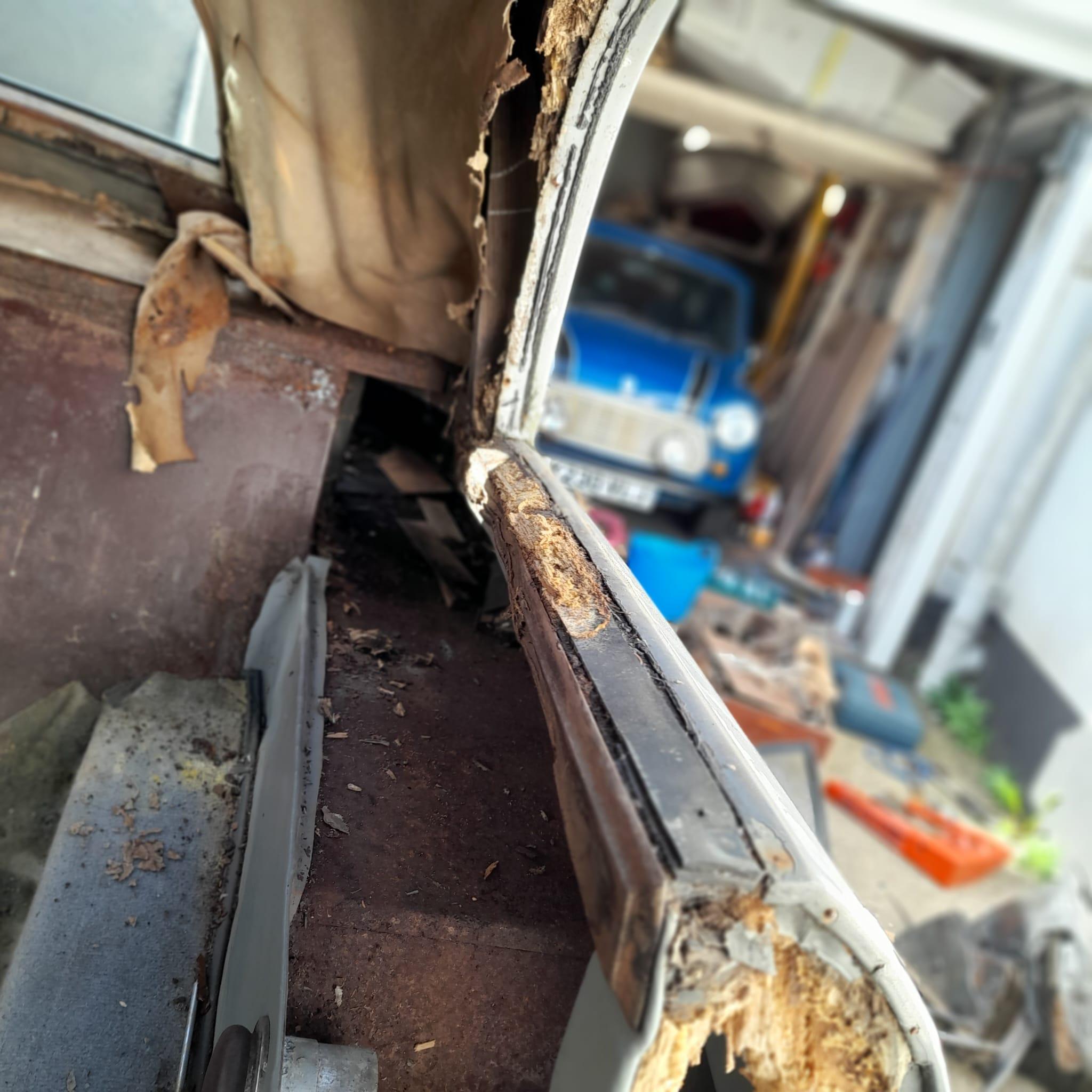 The decision wasn’t taken lightly, two things, firstly I couldn’t fit the car into my storage space height wise, secondly there were no wooden pillars left connecting the roof to the body. I did scribe some marks into the rear incision for future roof re-alignment.